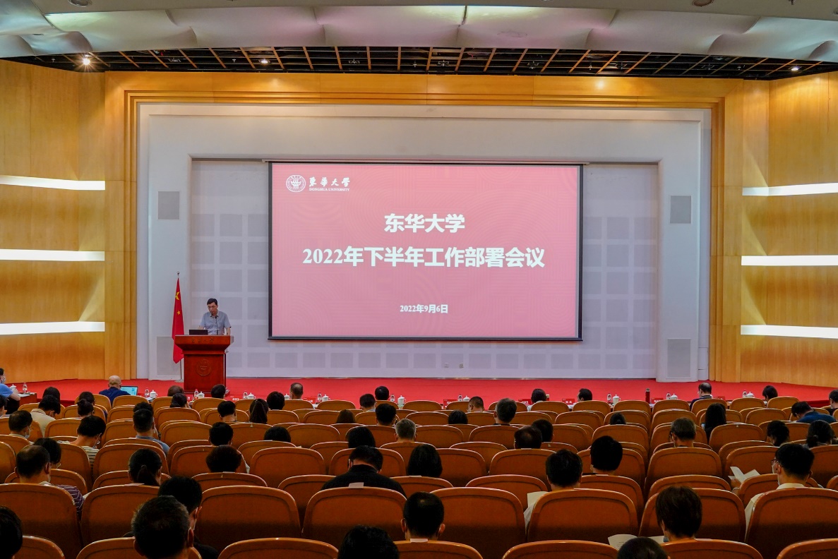 9月7日下午,学校在松江校区召开2022年下半年工作部署会,延安路校区设视频分会场。会议强调,要以习近平新时代中国特色社会主义思想为指导,深刻领会“两个确立”的决定性意义,增强“四个意识”,坚定“四个自信”,做到“两个维护”。以迎接学习贯彻党的二十大为主线,遵循新时代党的教育方针,落实立德树人根本任务,积极构建“大党建”格局,深入推进以学科建设为统领的高质量发展,凝心聚力,奋发有为,加快建设国内一流、国际有影响,有特色的高水平研究型大学,以实际行动迎接党的二十大胜利召开。